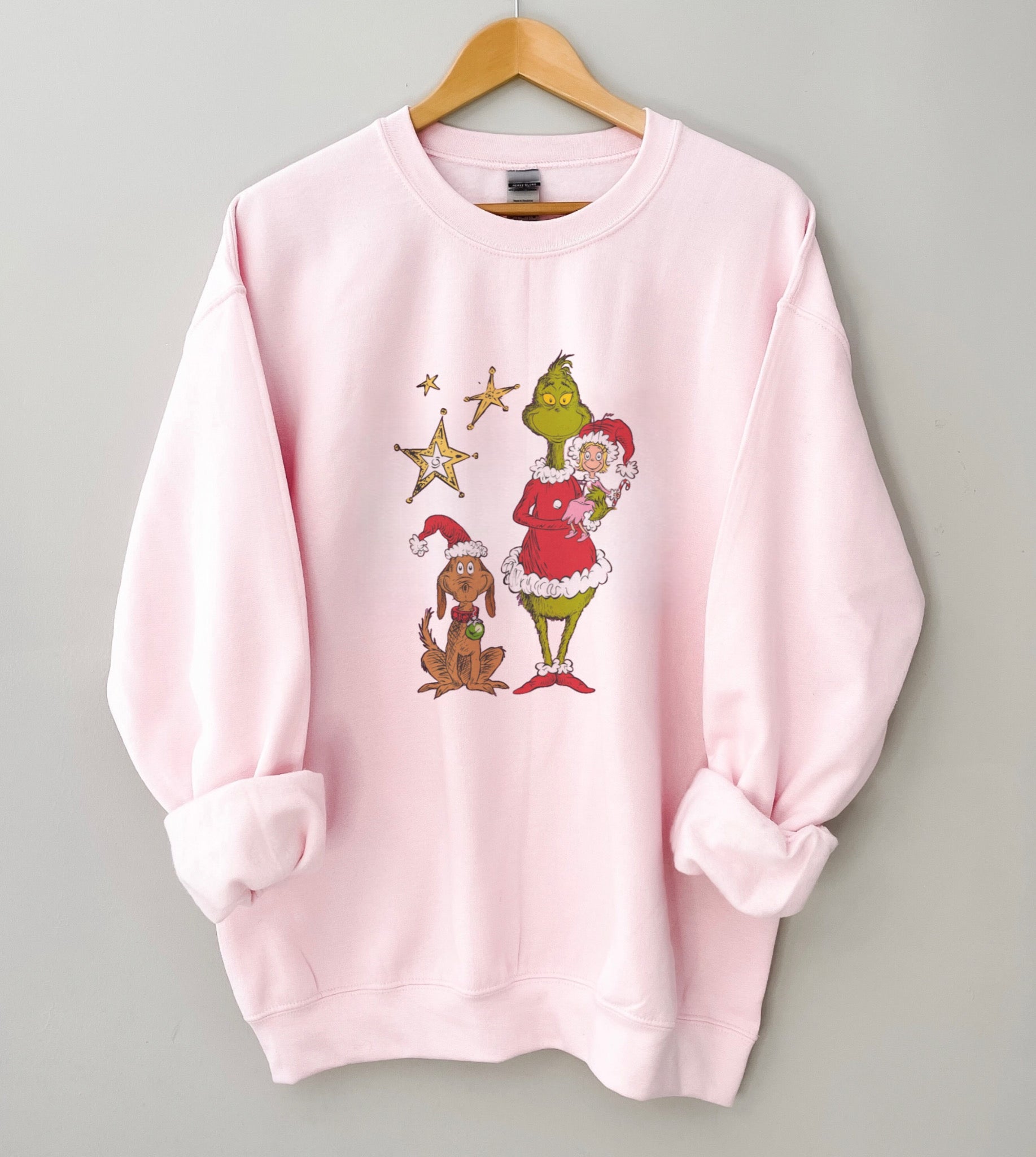 This classic Grinch Sweatshirt is the perfect addition to any wardrobe. Crafted from light pink fabric, it's cute yet timelessly trendy. Perfect for any Grinch fan!